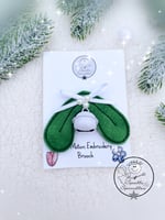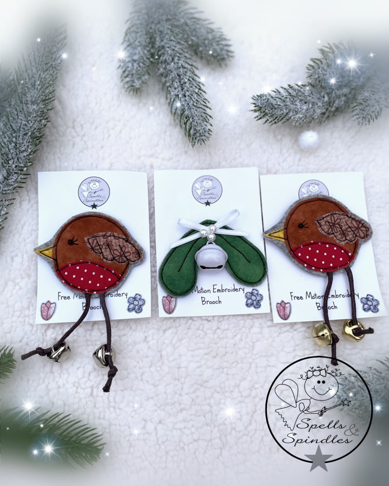 A free motion mistletoe or robin brooch with bells and beads for a little Christmas magic!