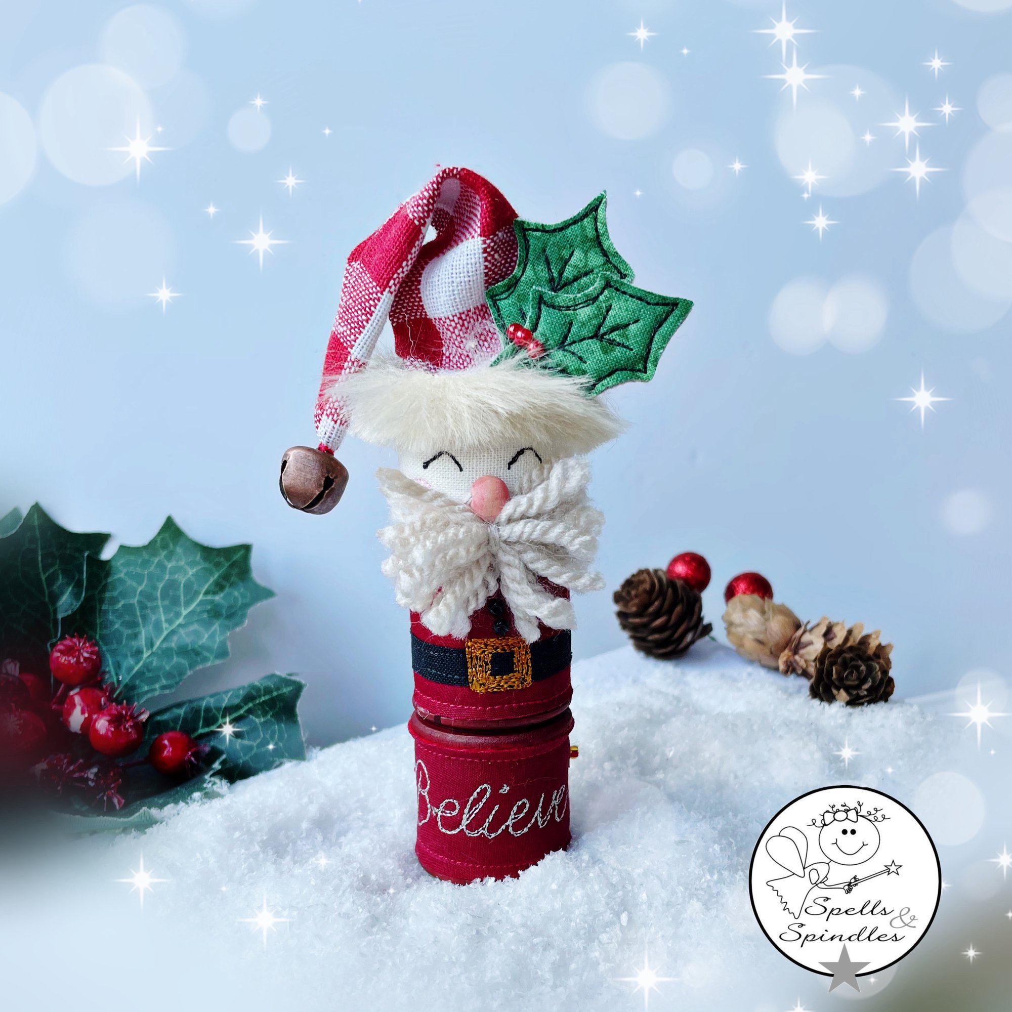 Unique Santa ornaments made from 3 vintage wooden cotton reels.