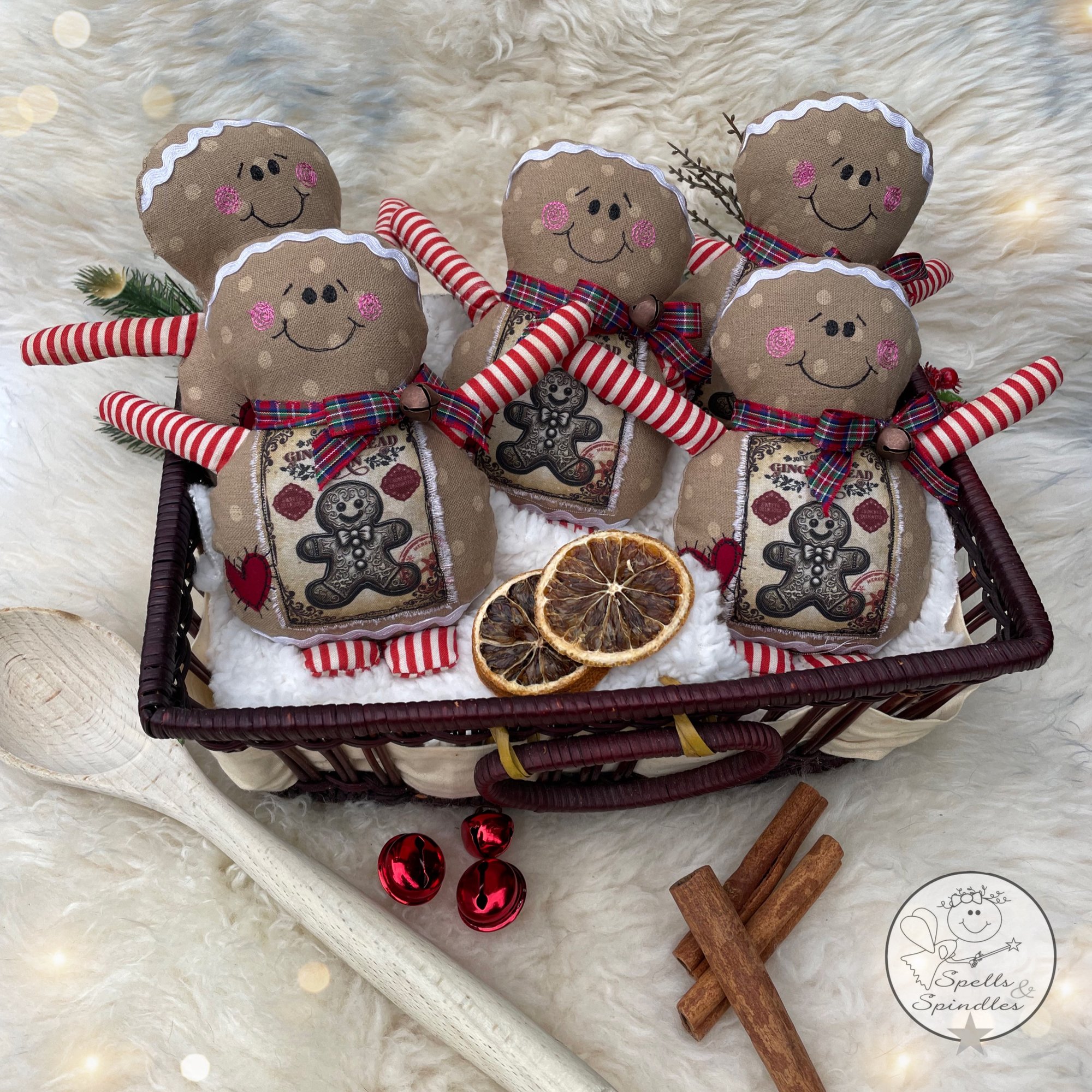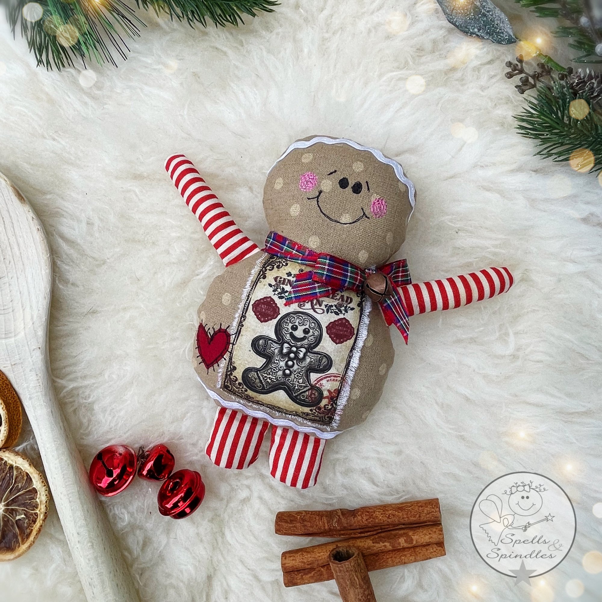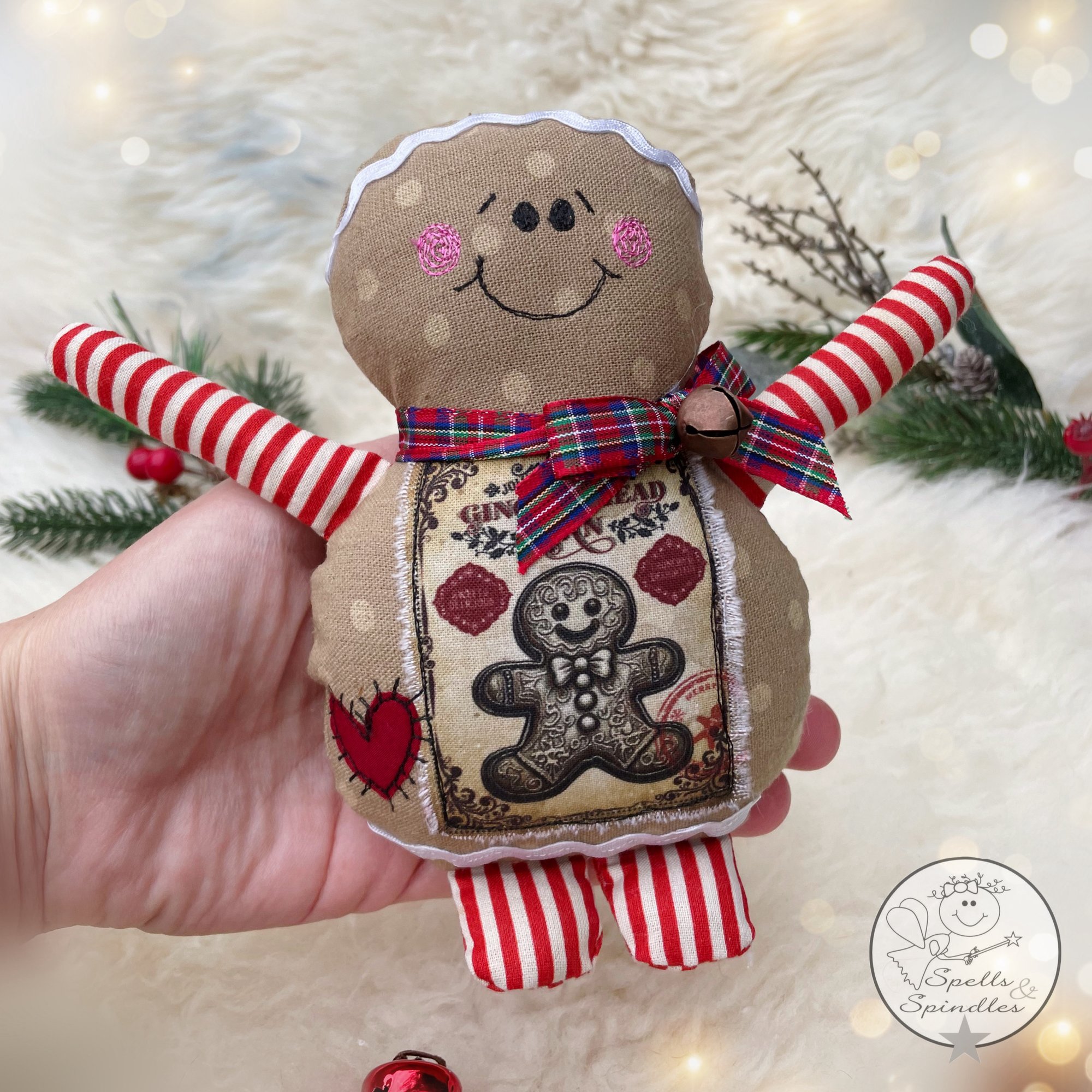 He has a vintage label on his body and a free motion heart. He is decorated with white ribbon for icing, and a tartan bow with a rusty bell.