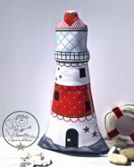 Decorative lighthouse cushion based on Portland Bill lighthouse.