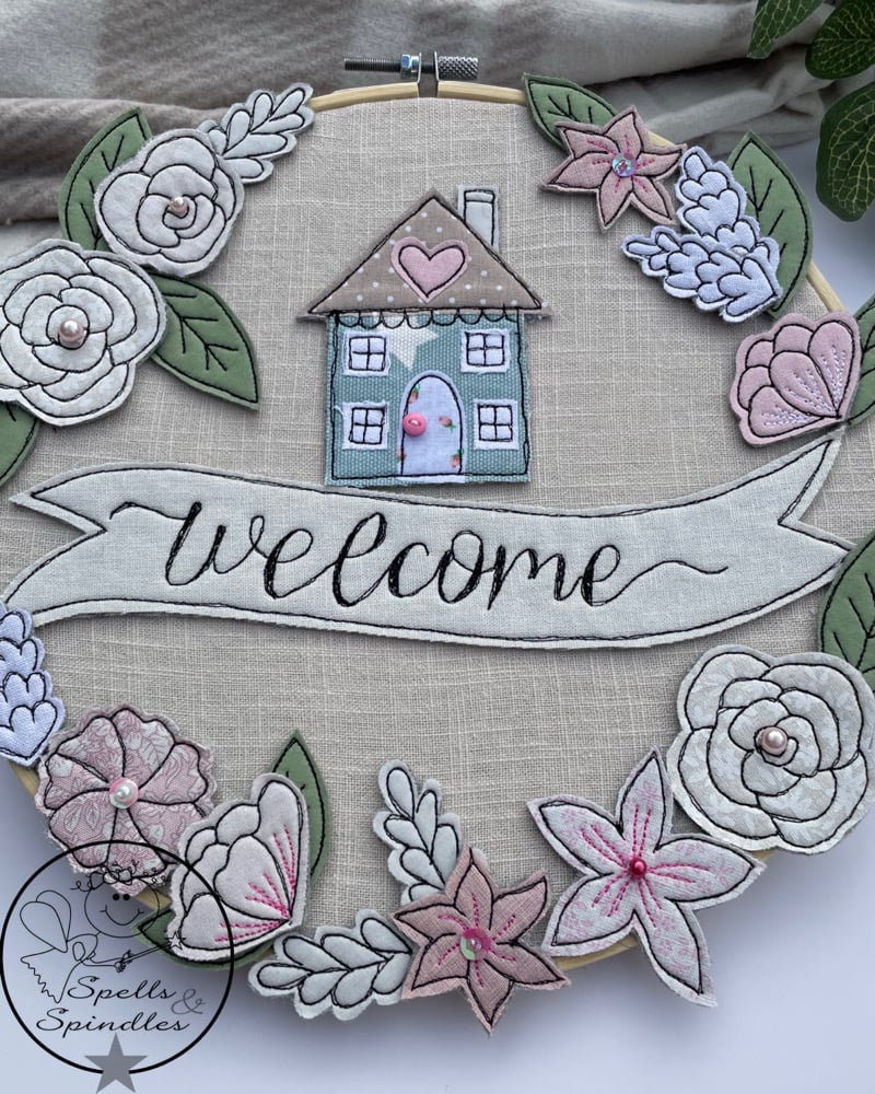 This hoop is made with lots of free motion pieces in neutral shades of white, cream and soft pinks, layered onto natural linen. The 3 dimensional pieces are made from cotton on 2mm grey wool felt that's then cut and arranged to form a wreath. The flowers are hand embellished with beads and sequins.